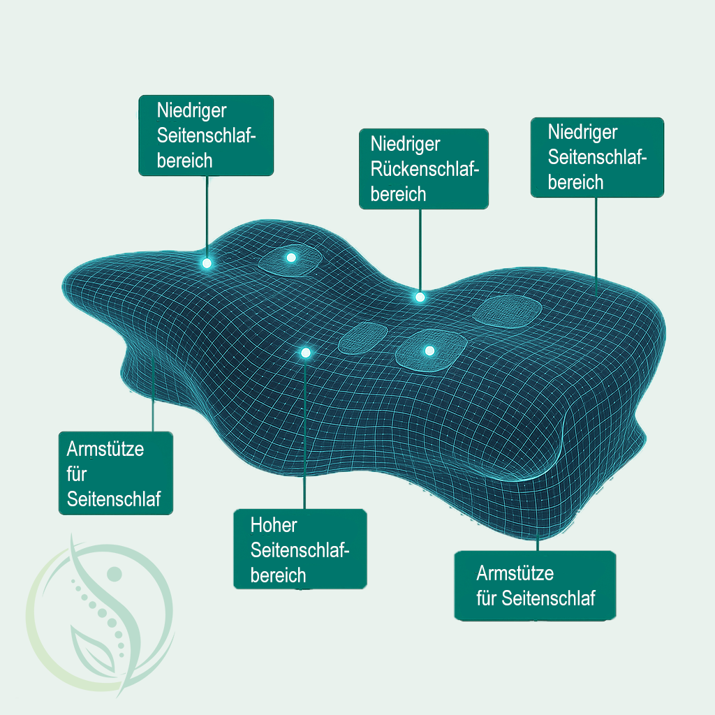 Die erhöhte Seitenstütze sorgt für perfekte Ausrichtung der Wirbelsäule, während die sanft abgesenkte Rückenliegefläche deinen Nacken befreiend entlastet.